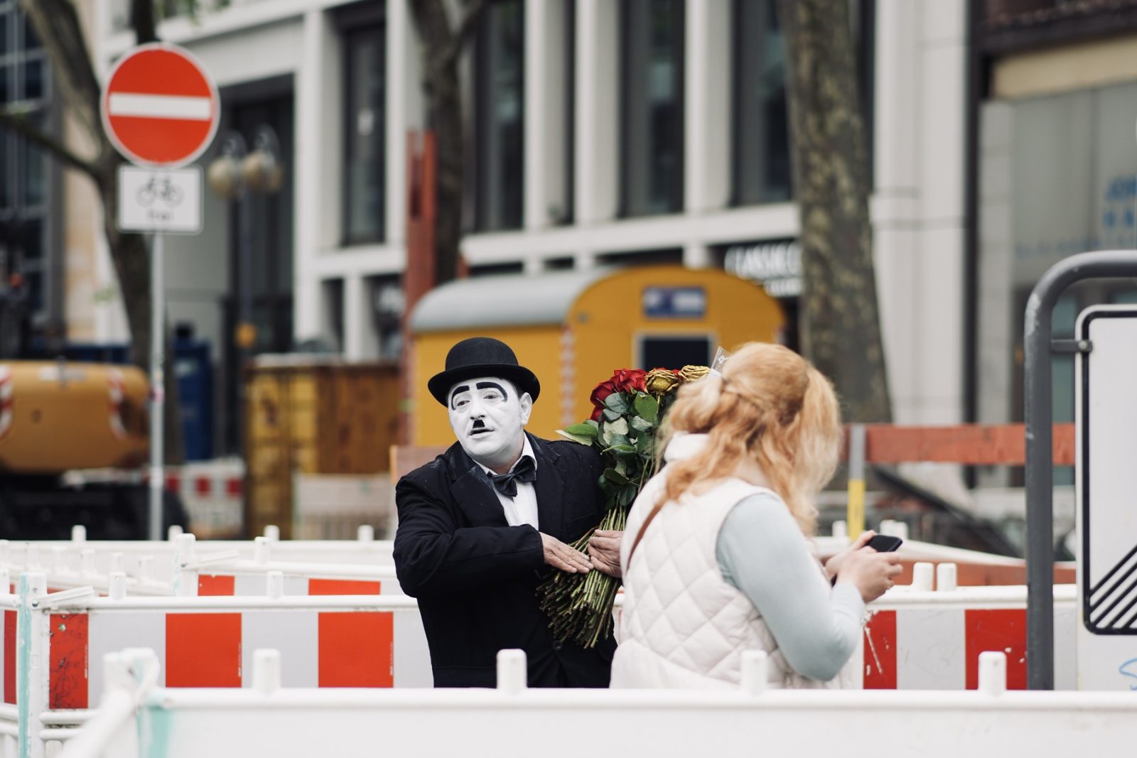 In Frankfurt zag ik hem lopen. Een straatkunstenaar met wit gezicht, zwarte hoed en een bos rode rozen — alsof hij zo uit een oude film was gestapt. Om hem heen haastte de stad zich voort. Mensen met gebogen hoofden, verdiept in hun schermen. Hij keek om zich heen, een beetje verloren, een beetje hoopvol — alsof hij smeekte om liefde, of om iemand aan wie hij die bloemen kon geven. Terwijl de meesten waarschijnlijk net emoji-bloemen of hartjes stuurden via hun telefoons. De rood-witte hekken, het verboden-inrijden-bord, de grijze gevels — alles leek toevallig, maar samen vormden ze een vreemd soort harmonie. Alsof de stad zelf even stilhield om hem ruimte te geven. Misschien was dat zijn kunst: ons eraan herinneren dat echte bloemen zwaarder wegen dan digitale gebaren. Dat er nog steeds mensen zijn die wachten, met open armen, midden op straat, op iets wat echt is.