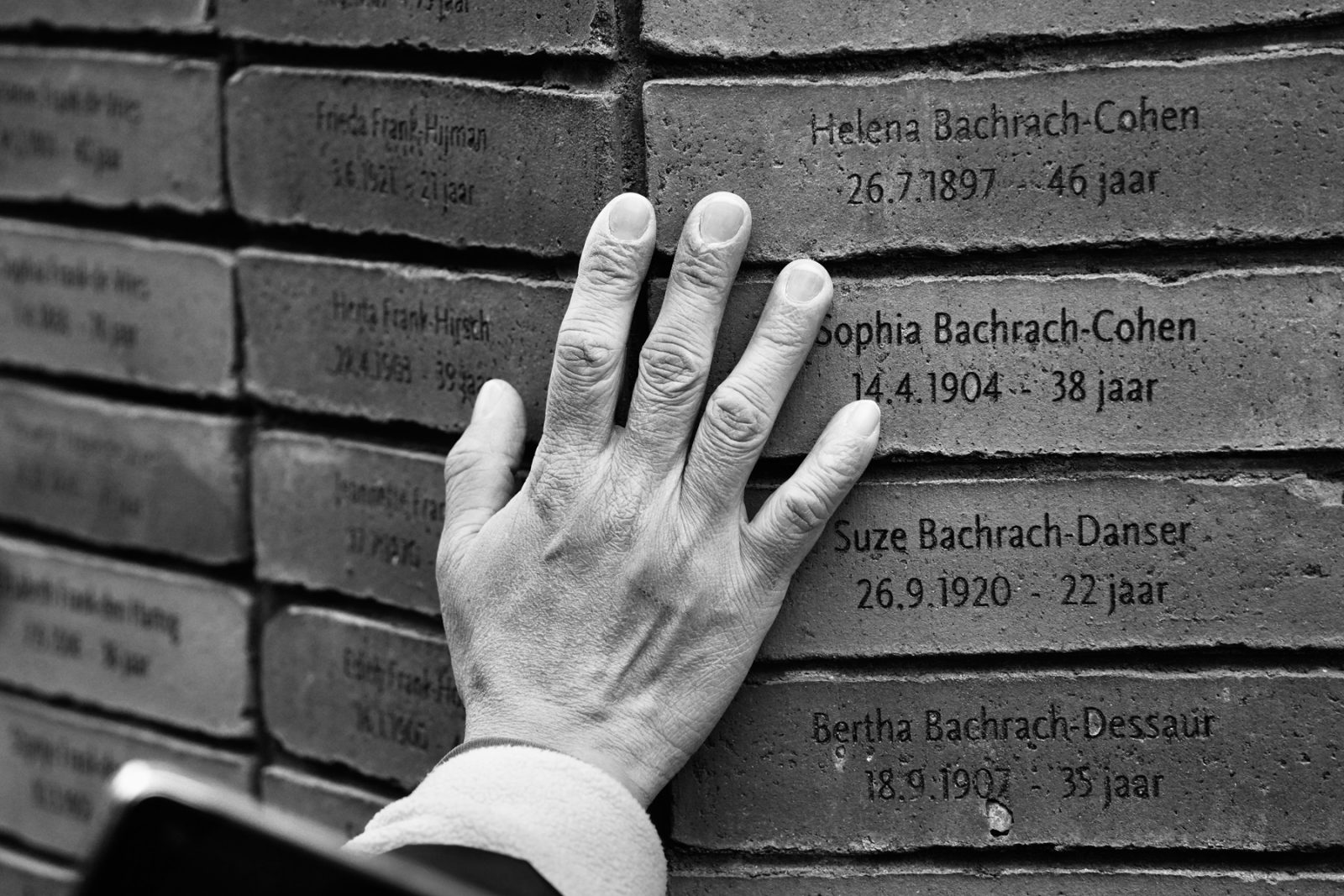 Deze foto, genomen bij het Holocaust Namenmonument in Amsterdam, toont de hand van een vriendin van mij, rustend op de namen van vermoorde Joodse vrouwen. We waren samen bij het monument, en ik bevond mij op een kleine afstand. Ik zag hoe zij in stilte de bakstenen aanraakte, alsof ze contact zocht met de mensen achter de namen—Helena, Sophia, Suze, Bertha. De aanraking was teder en geladen, een gebaar van respect, herinnering en diepe betrokkenheid. Op dat moment voelde ik hoe kwetsbaar het leven is, toen én nu. In haar gebaar zat zoveel: verdriet, empathie, verbondenheid. En juist dat raakte me. Ik wilde dit vastleggen—niet als toeschouwer, maar als getuige van een levend herinneren. In een tijd waarin het menselijke bestaan opnieuw onder druk staat en geweld dichtbij komt, herinnert dit beeld ons aan de kostbaarheid van elk leven. Het monument spreekt, maar haar hand maakt het voelbaar. Namen in steen worden opnieuw mensen van vlees en bloed—geliefden, ouders, kinderen.