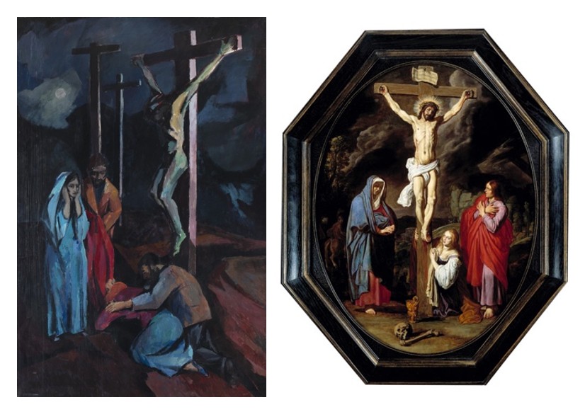 De kruisdood van Jezus is natuurlijk de ultieme vorm van zelfopoffering. Het leven loslaten uit liefde voor anderen. Door de eeuwen heen hebben kunstenaars de kruisiging verbeeld in schilderijen, reliëfs en als sculptuur. Er zijn vele voorbeelden van te vinden in de collectie van Museum Catharijneconvent. In deze tentoonstelling hangen twee schilderijen van de kruisiging naast elkaar: van Jan Groenestein uit 1953 en van Pieter Lastman uit 1625. Op het schilderij van Groenestein is Jezus gestorven. Met het hoofd gebogen hangt zijn levenloze lichaam aan het kruis. Aan de expressieve houding en gebaren van de omstanders is het verdriet om zijn dood duidelijk te zien. Op het schilderij van Lastman leeft Jezus nog. Hij kijkt ons aan. Zijn opoffering is het middelpunt van het schilderij. Johannes en Maria Magdalena kijken geëmotioneerd naar hem op. Zijn moeder Maria wringt haar handen ineen van verdriet. Lastman, de leermeester van Rembrandt, was een meester in het verbeelden van emoties. De kleurstelling van beide schilderijen sluit verrassend goed bij elkaar aan. Het is boeiend om ze naast elkaar te zien hangen.