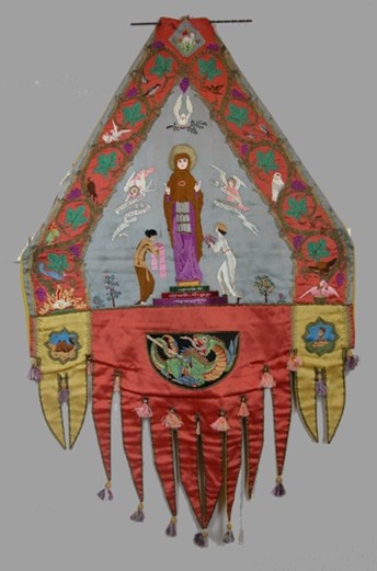 Naastenliefde kan ook het opofferen van jezelf zijn voor het welzijn van de ander. Dat is het thema van een vaandel afkomstig van een missiepost op Java in Indonesië. Daar werd in 1921 het Sint Melania-werk opgericht om het christelijk geloof te verspreiden, vooral onder Javaanse vrouwen. Op het vaandel staat de heilige Melania als symbool voor vrede en nieuw leven. Op de linten die de engelen vasthouden is te lezen: naastenliefde, zelfopoffering, milddadigheid en nederigheid. Onder haar voeten staan dezelfde teksten in het Javaans. Een pelikaan doorboort haar borst om haar jongen te voeden, Abraham staat op het punt zijn zoon te offeren en het Lam Gods verwijst naar de kruisiging. Zal het de Javaanse vrouwen hebben aangesproken? Het is in ieder geval een prachtig geborduurd, kleurrijk vaandel geworden.