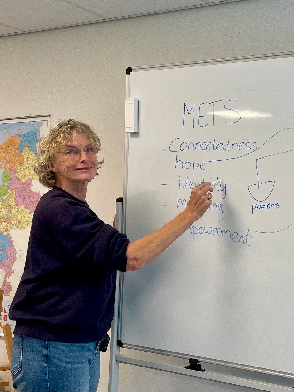 Ze maakt de training op maat voor de groep. Zo kwam er een keer een gesprek op gang over nare dromen. Wakker worden uit een nachtmerrie kan doorwerken in je gemoedstoestand. “Toen hebben we besproken hoe de verschillende deelnemers daarmee omgaan. Wat helpt jou? En hebben we een ademhalingsoefening gedaan die je kunt doen om je weer rustig te voelen.”
