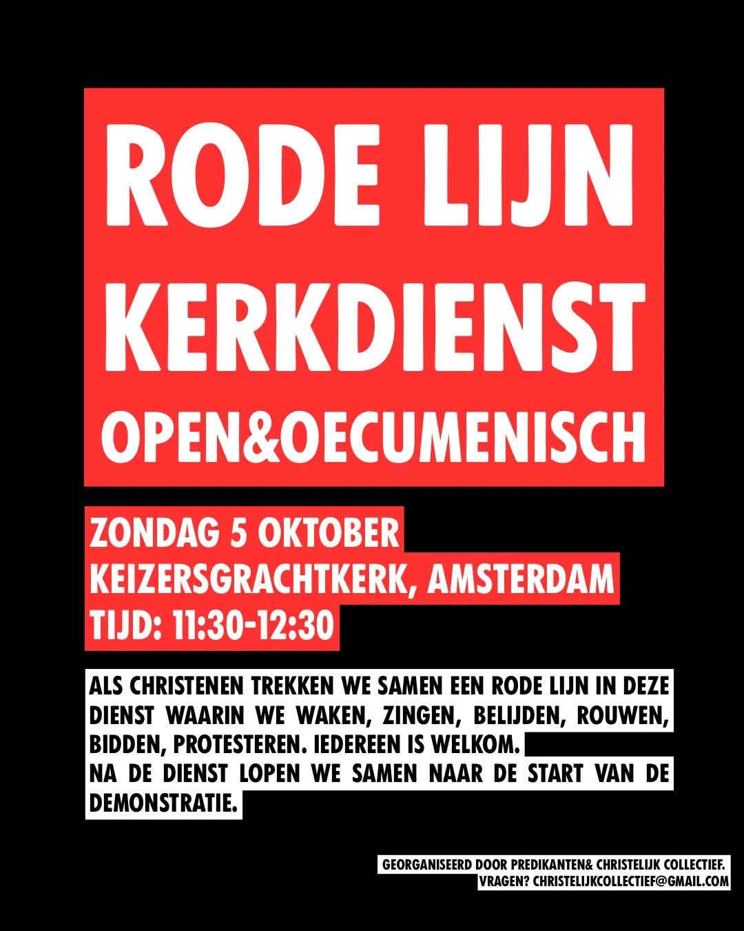 Iedereen is van harte welkom. Na afloop van de kerkdienst kan gezamenlijk naar de start van de demonstratie worden gelopen. De Rode-Lijnkerkdienst op zondag 5 oktober begint om 11.30 uur en duurt tot uiterlijk 12.30 uur. Het is een open en oecumenische viering met als voorgangers Janneke Stegeman, Mariecke van den Berg en Annelies Jans.