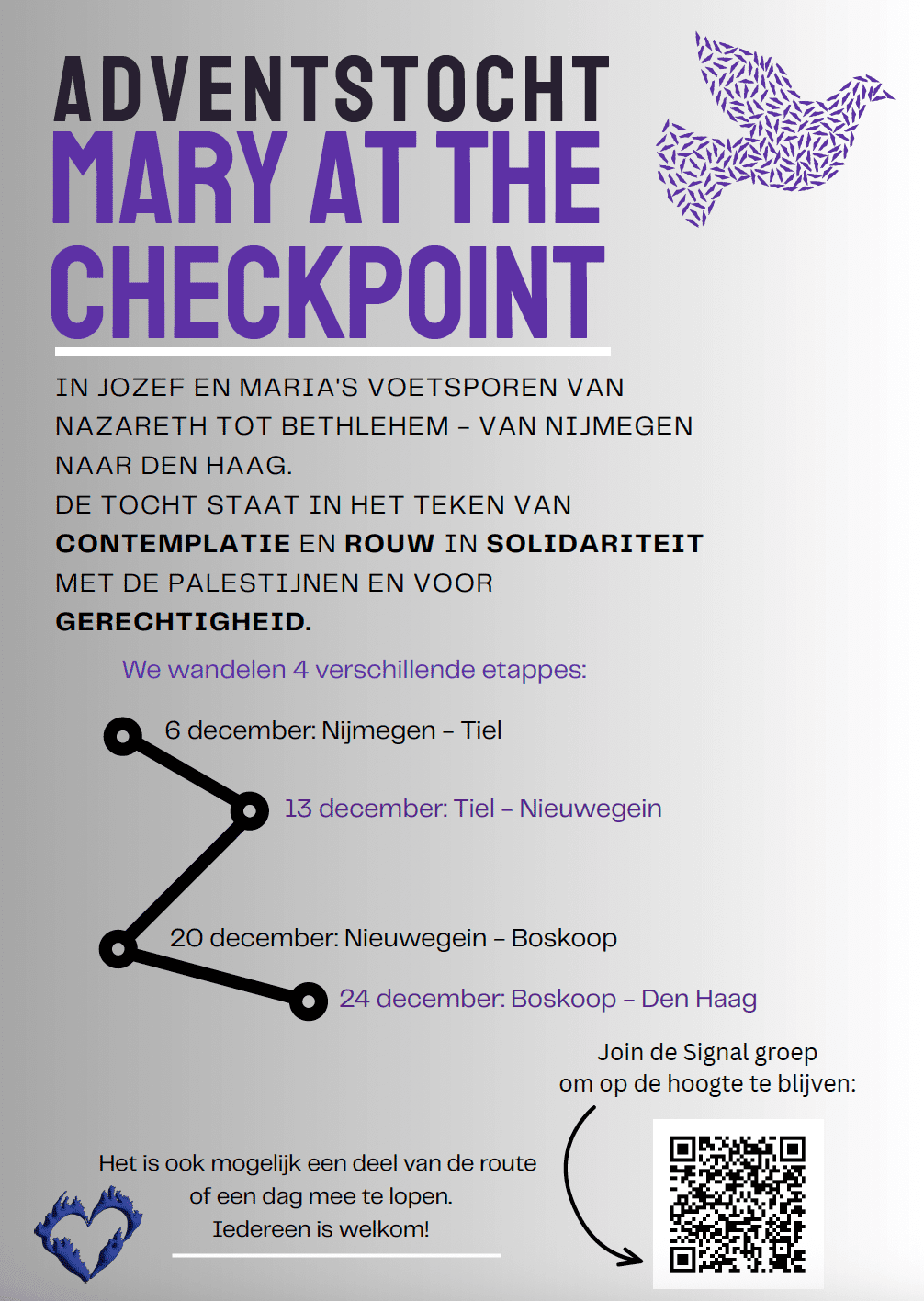 De route bestaat uit vier etappes, die gelopen worden op 6, 13, 20 en 24 december. Iedereen is welkom om aan te haken; je kan een hele dag meelopen, een deel of veel meer. Voel je vrij om mee te doen op een manier die bij je past. Elke route start rond 8.30 uur en komt langs een aantal bushaltes en/of treinstations waar je goed kunt aanhaken. De route is als volgt: