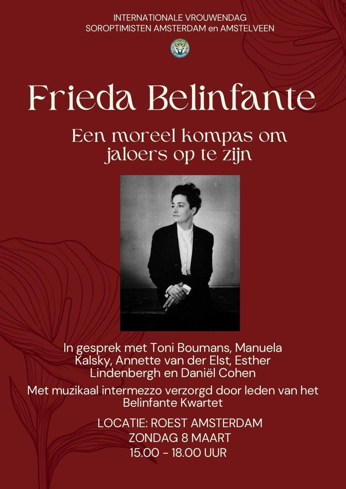 ● Toni Boumans geeft een lezing. Zij is journalist, schrijver en documentairemaker en maakte een documentaire en schreef een boek over Frieda Belinfante.