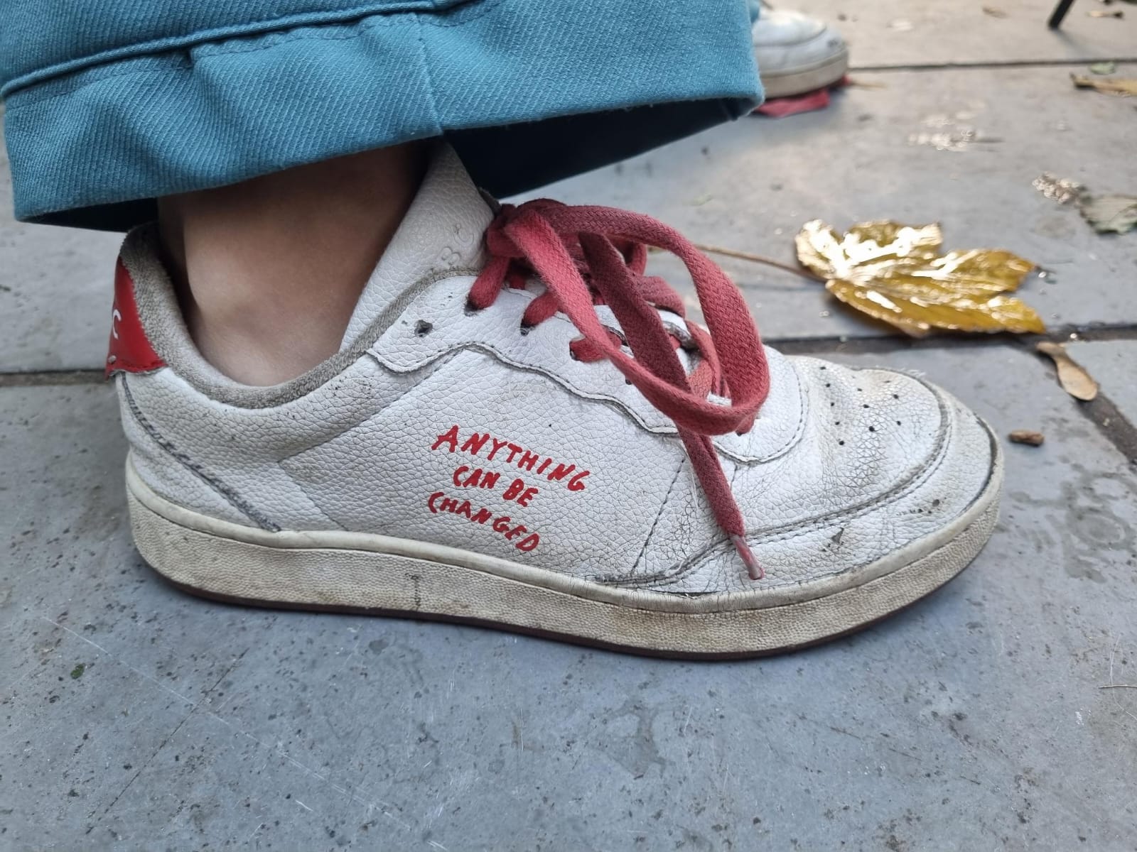 Ik denk na en kijk naar onze voeten. Zijn rechtervoet staat op een blauwe step met coole LED-lampjes in de voorwielen. Ik probeer hem bij te houden op afgetrapte sneakers. Die schoenen kocht ik niet enkel om het leer van fruitschillen, maar vooral omdat de merknaam ACBC voluit in rode letters op de buitenkant staat. Anything Can Be Changed. Zo openden mijn schoenen al een paar gesprekken over wat er anders kan en moet.