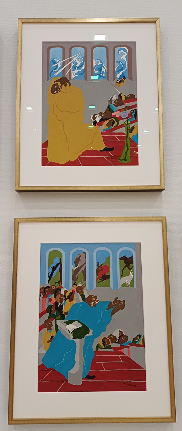 In zijn serie Genesis Creation Sermons (1989) zie je de schepping uitgebeeld met een voorganger in een kerk die in zijn preek op intense wijze de scheppingskrachten opnieuw voelbaar maakt en zo de schepping als het ware opnieuw laat gebeuren en geboren worden voor de ogen van de kerkgangers. De scheppingsmomenten verschijnen letterlijk achter de kerkramen! Die intensiteit, die diepgevoelde betrokkenheid treedt uit elk schilderij van Lawrence naar voren en raakt ook de toeschouwer van nu op een niet vrijblijvende manier. Het werk is niet bedoeld als mooi maar als echt. Bijvoorbeeld in de serie Harriët and the promised land (een illustratie uit het prentenboek uit 1967) neemt Tubmans expressieve gebaar van ‘volg mij’ het volledige vlak van het schilderij in. Het werk van Lawrence beeldt zijn voortdurende strijd uit om gerechtigheid voor de Afro-Amerikaanse mens in de loop van de twintigste-eeuwse geschiedenis. Lopend langs zijn tentoonstelling kun je je als toeschouwer niet onttrekken aan die geschiedenis want gaandeweg gaat het heden waarin wij leven daar steeds meer in resoneren.