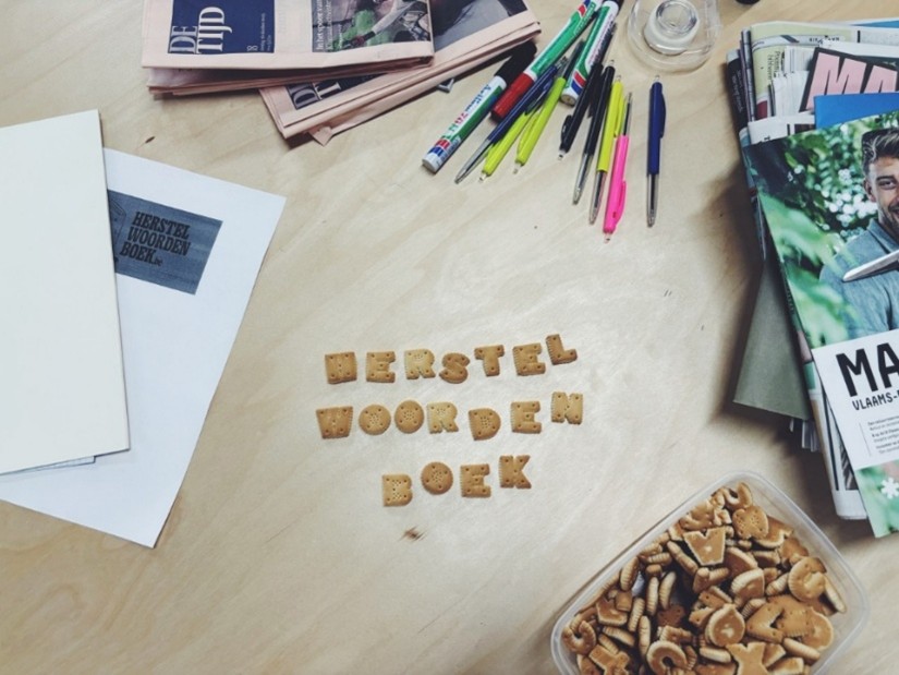 Tijdens de workshop lag ‘herstelwoordenboek’ in letterkoekjes op tafel. Een prachtig woord, dat meteen tot de verbeelding spreekt. Maar fabriekskoekjes missen chi, ki, levensenergie. Als je met je handpalm achtereenvolgens een berg koekjes en vers geschilde appelpartje scant, voel je duidelijk wat het meest tintelt. Op deze manier wil ik op zoek naar levende taal die onder onze handen vonkjes verspreidt en toekomstpaden toont.